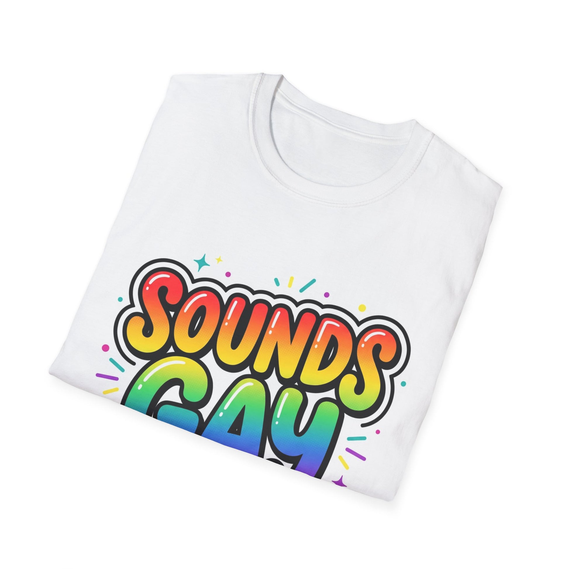 This lightweight cotton tee carries a bold, joyful statement — a burst of rainbow lettering that reads “SOUNDS GAY (I’M IN)” with playful sparkles and confetti accents. It feels like showing up as yourself: bright, confident, and a little cheeky. Wear it to pride events, casual hangs, or nights out when you want to send a cheerful signal without saying a word. The smooth ring-spun fabric sits softly against skin and holds printed colors clean and crisp. Subtle details — tear-away label, reinforced shoulder tape, and a ribbed collar — keep the fit neat and comfortable through repeated wear. Made and certified for safety and sustainability, this tee blends everyday comfort with unapologetic personality.